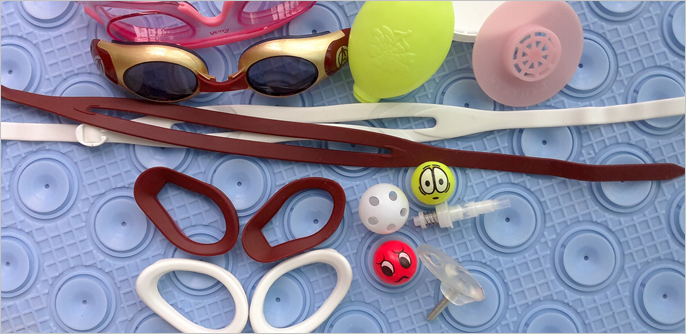 물안경의 P/K 밴드, 다이버의 산소 호흡기 장치와 안경, 귀마개와 수영모자, 물갈퀴와 오리발, 골프채의 충격 흡수팩, 테니스의 각종 라켓, 각종 스포츠화의 응용, 스포츠 안경의 충격 흡수 밀폐기능, 고정기능에 응용이 가능합니다.